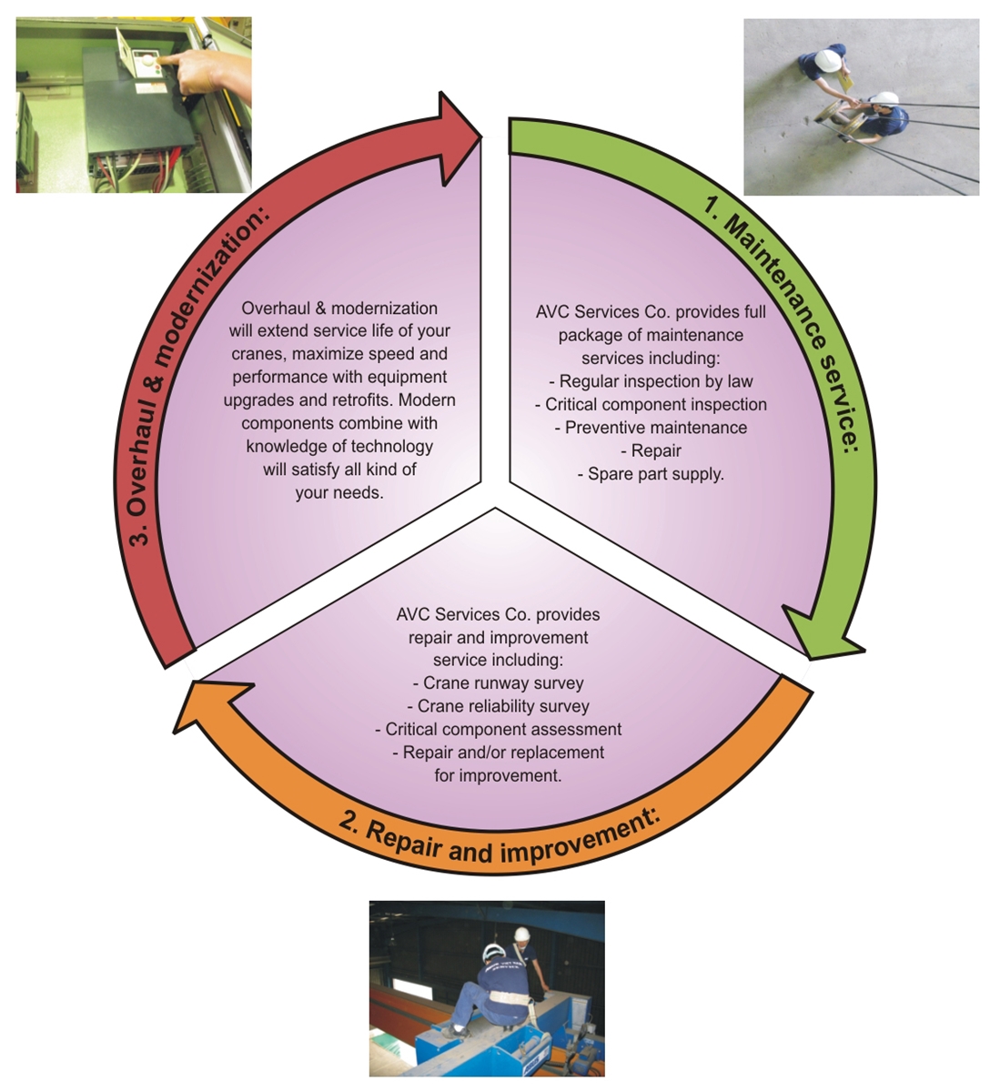Cải tạo, nâng cấp và hiện đại hoá: Tuỳ theo yêu cầu của khách hàng AVC Services cung cấp các dịch vụ nâng cấp, cải tạo và hiện đại hoá các cầu trục hiện có của khách hàng để kéo dài tuổi thọ và giảm chi phí đầu tư cơ bản cho khách hàng.