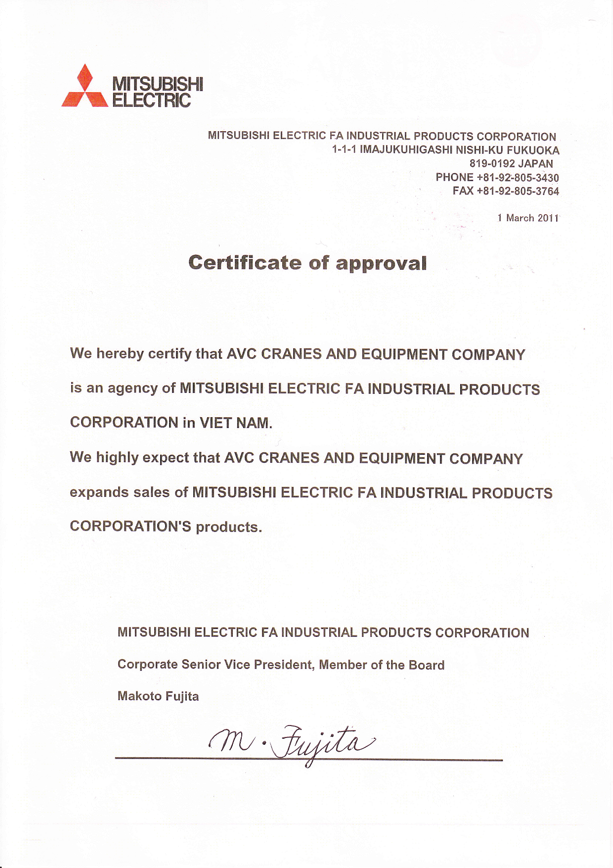 Giấy chứng nhận đại lý của Mitsubishi hoist